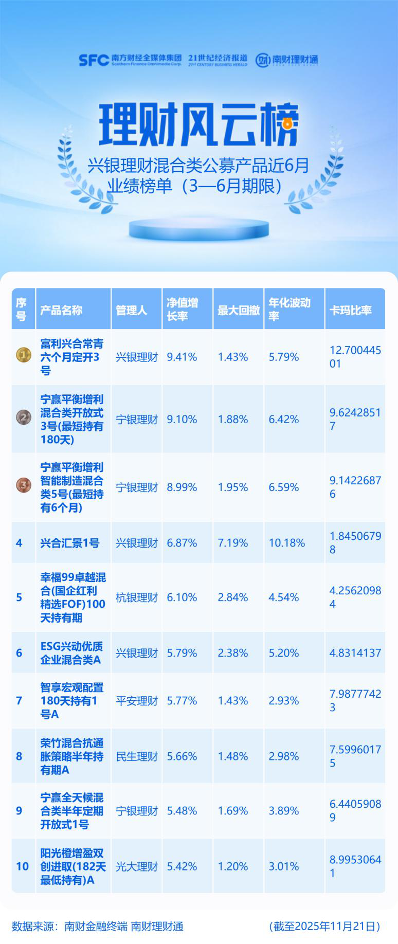 榜單數(shù)據(jù)說明:統(tǒng)計對象為理財公司發(fā)行的3-6個月(含)投資周期的公募混合類產(chǎn)品,同系列同投資周期產(chǎn)品保留一只,統(tǒng)計區(qū)間為近6月,截至時間為2025年11月21日。理財產(chǎn)品數(shù)據(jù)來源于南財理財通(https://newgym.sfccn.com/),股票數(shù)據(jù)來源于Wind。榜單排名由理財通AI全自動化實時排名,如您對數(shù)據(jù)有疑問,請在文末聯(lián)系助理進一步核實。