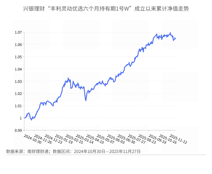 據(jù)南財理財通數(shù)據(jù),興銀理財“豐利靈動優(yōu)選六個月持有期1號”成立于2024年5月29日,為R3風(fēng)險等級的固收增強(qiáng)產(chǎn)品,下設(shè)A、W兩個子份額,其中W份額成立于2024年10月30日,業(yè)績比較基準(zhǔn)為“中債-新綜合全價(總值)指數(shù)收益率×95%+滬深300指數(shù)收益率×5%”。
