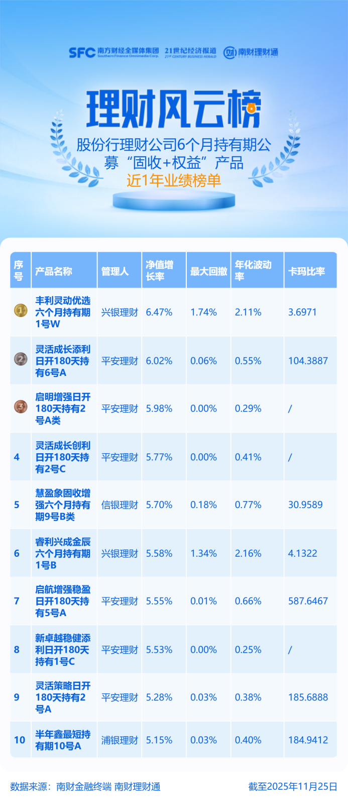 榜單數(shù)據(jù)說明:統(tǒng)計(jì)對象為股份行理財公司發(fā)行的6個月持有期的公募“固收+權(quán)益”產(chǎn)品,同系列同投資周期產(chǎn)品保留一只,統(tǒng)計(jì)區(qū)間為近1年,截至?xí)r間為2025年11月25日。理財產(chǎn)品數(shù)據(jù)來源于南財理財通(https://newgym.sfccn.com/)。榜單排名由理財通AI全自動化實(shí)時排名,如您對數(shù)據(jù)有疑問,請?jiān)谖哪┞?lián)系助理進(jìn)一步核實(shí)。