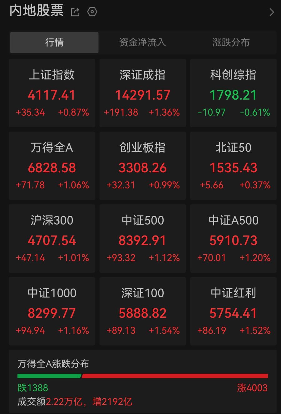 當(dāng)天開盤后,三大股指震蕩走強(qiáng),而后沖高回落。截至收盤,上證指數(shù)全天漲0.87%、報4117.41點;深證成指漲1.36%,報14291.57點;創(chuàng)業(yè)板指漲0.99%,報3308.26點。