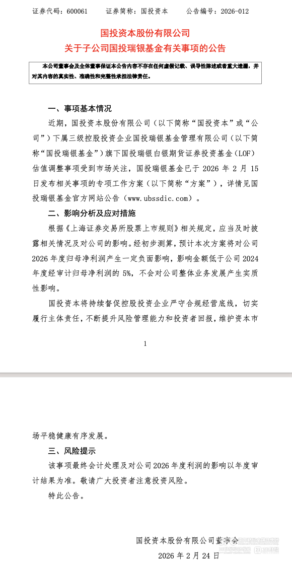 這一被業(yè)內(nèi)稱為“跨越免責(zé)區(qū)”的罕見操作,其財(cái)務(wù)影響也終于在2月24日得到母公司層面的確認(rèn)。國(guó)投瑞銀基金的母公司國(guó)投資本股份有限公司(600061)于2月24日發(fā)布公告,就本次補(bǔ)償方案對(duì)公司業(yè)績(jī)的潛在影響進(jìn)行說(shuō)明 。